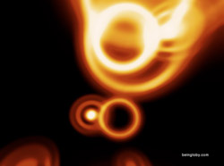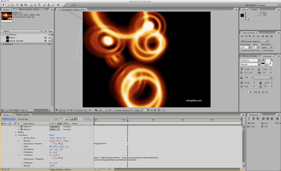Shining elementary circles, wiggeling in the 3D space, use expressions to make an object movement without timeline-keyframes or a motionpath, programmed movement and merging.