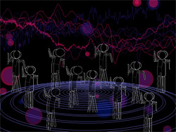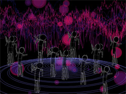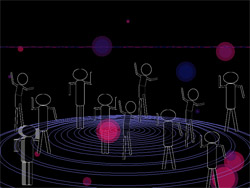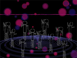 Bei unserem Projekt handelt es sich um eine Schallplatte, auf welcher Figuren tanzen. Im Hintergrund gibt es farbige Discolichter und gerade in diesem Moment läuft das Lied " so this is Goodbye" von den Junior Boys passend zur Musik haben wir eine Audiowelle erzeugt die über den Köpfen der Tänzer schwebt.